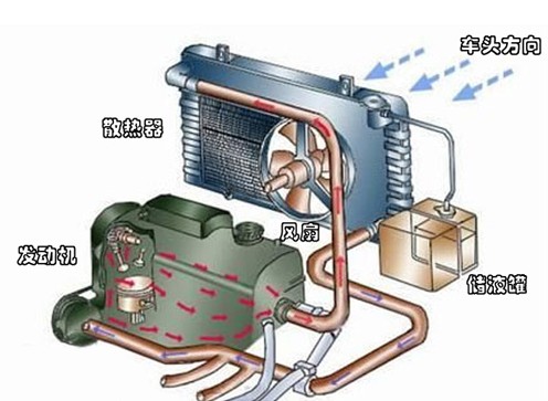 由皮带驱动的水泵是对冷却液进行加压,保证冷却液可以在冷却系统中循环流动。而散热器(又称为水箱)与散热风扇被设置在车头位置,一般会在车头前杠上设计帮助散热器散热的开口。发动机工作时,冷却液在散热器芯内流动,在汽车行驶中通过撞风原理将空气在散热器芯外通过,热的冷却液由于向空气散热而变冷。