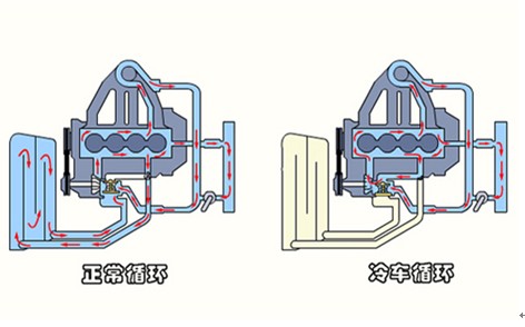 冷车循环(小循环)是指在发动机冷启动后,温度较低的冷却液不会将节温器打开,此时冷却液只经过水泵在发动机的水道中进行循环,目的是使发动机尽快达到正常的工作温度,等发动机温度上升,冷却液温度达到节温器设定值(一般为80度)时,节温器阀门打开,冷却液进行正常循环(大循环),这时冷却液从发动机水道中流出,经过车头位置的散热器,进行散热,水泵再将散热冷却后的冷却液送人发动机进行冷却循环,节温器负责控制循环模式的切换,使发动机尽量保持在最佳工作温度。